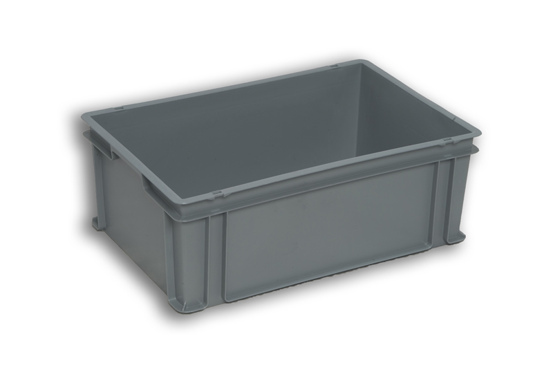 A grey solid stacking plastic tray which has solid sides and base with hand grips in short walls