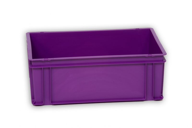 A purple solid stacking plastic tray which has solid sides and base with hand grips in short walls