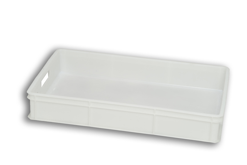 A natural solid plastic stacking tray which has solid sides and base and hand holes in short walls