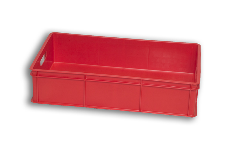 A red solid stacking plastic tray with solid sides and base and hand holes in short walls